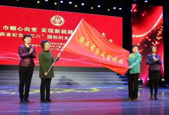 省婦聯(lián)副主席單紅和省文明辦綜合處處長胡紀(jì)美為“陜西省家風(fēng)宣講團(tuán)”授旗